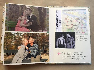 I found the postcard, above, at the Paris Flea Market. Below, my husband and I reenact it!