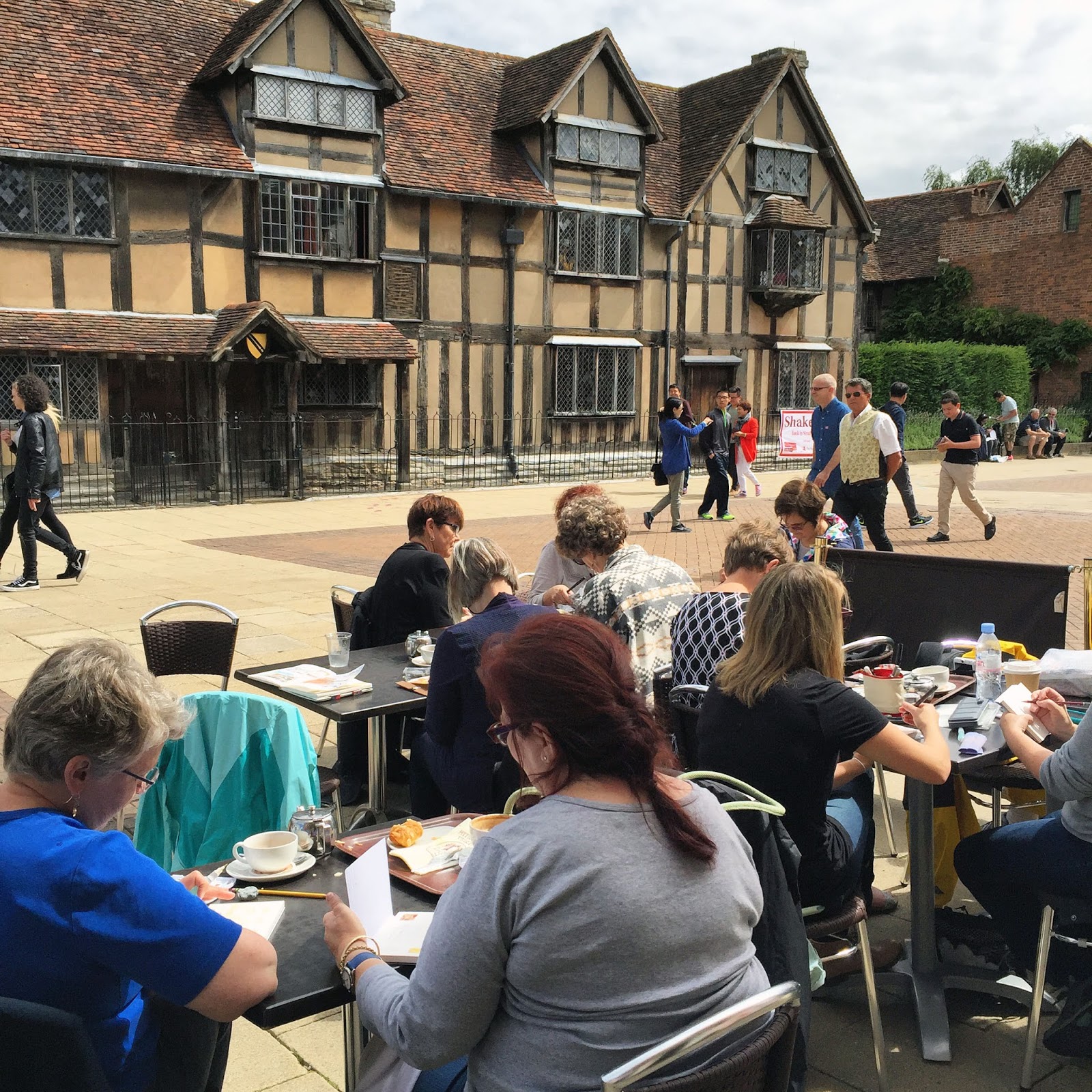 Have you wondered what my Sketching and Watercolor trips are like? The top photo says it all! I teach on location. The students grabbed some tables at the cafe across from Shakespeare's house and I did a demo and then they drew and painted with my encouragement and instruction. (And yes, I made them order tea and scones at the cafe!)